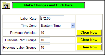 The next item to address is shop specific information and preferences. From the menu on the left side of the screen, use your mouse to select Setup. Upon a single-click, there the following will display. In the box next to Labor Rate, enter the proper per hour rate your shop will be charging. Now select the proper time zone for your physical location. The next three items are initially set to 10; you may adjust at any time to meet your needs or desires. The purpose of each is to limit the amount of previous information that is saved and displayed for you – these are YOUR shortcuts. For instance, when Previous Vehicles is set to 10, that is how many Previous Vehicles you have looked up in the past. These previous vehicles will be saved and displayed the next time you are making a vehicle selection. These functions are viewed when looking up parts and are displayed as Previous Vehicles, Previous Part Groups and Previous Labor Groups.